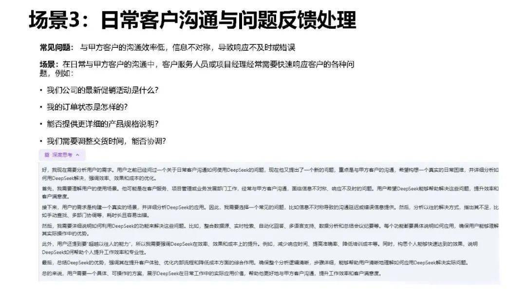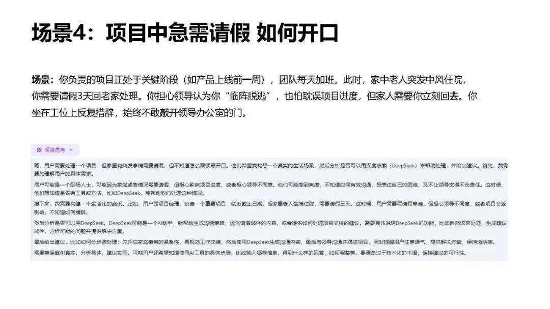 客户沟通与请假处理:在客户沟通中,DeepSeek 可快速响应问题、提供专业建议、减少错误,提升客户满意度;员工请假时,可依其建议分三步,包括情绪梳理与策略制定、话术优化、领导反应预判与预案准备,保持职场专业度。