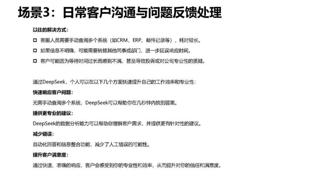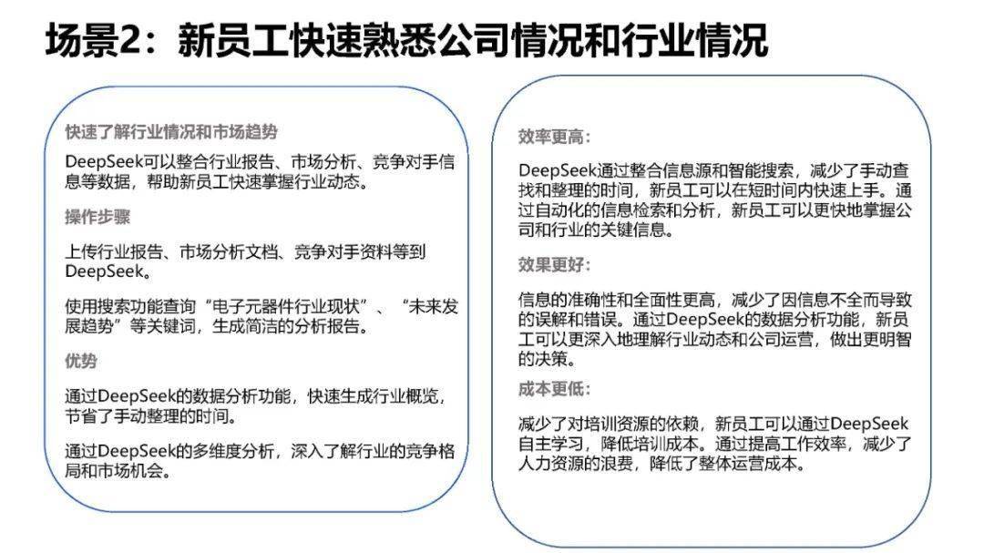 新员工入职:新员工能借助 DeepSeek 快速熟悉公司情况,上传产品手册等资料后搜索查询,还可了解行业动态,它能整合信息并生成分析报告,相比传统方式效率更高、效果更好且成本更低。