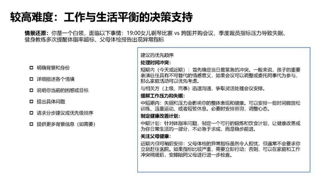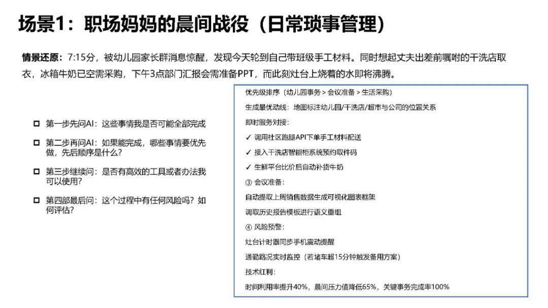 日常琐事管理:职场妈妈等面对繁杂事务,可通过向 DeepSeek 询问优先级、最优动线、工具方法及风险评估等,提升时间利用率,如协调采购、会议准备等事务并监控风险。
