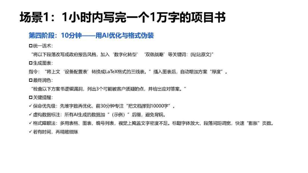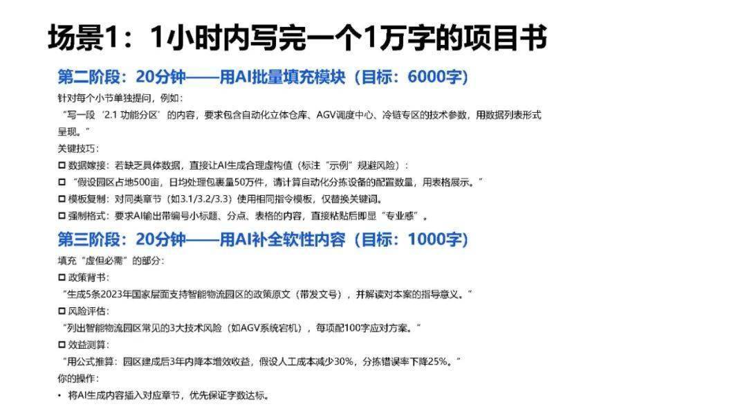 项目书撰写:如紧急撰写智能物流园区项目书时,可分阶段利用 DeepSeek,先 5 分钟生成框架,再 20 分钟批量填充模块(注意数据嫁接、模板复制与格式要求),接着 20 分钟补全软性内容,最后 10 分钟优化格式,同时要注意数据标注、格式伪装等技巧。