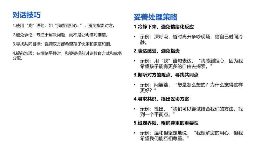 处理婆媳关系:婆媳因教育孩子等问题产生冲突时,要冷静下来,用 “我” 语句表达感受,倾听对方观点,寻求共识与妥协方案,设定尊重界限,改善家庭氛围。