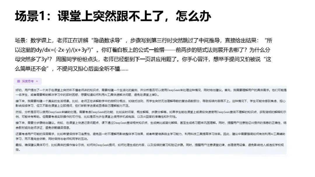 课堂学习辅助:课堂跟不上时,可在笔记中标注困惑点,课后向 DeepSeek 精准提问获取解析、类比解释、记忆口诀等,辅助学习,但要注意验证信息准确性并遵守课堂纪律。