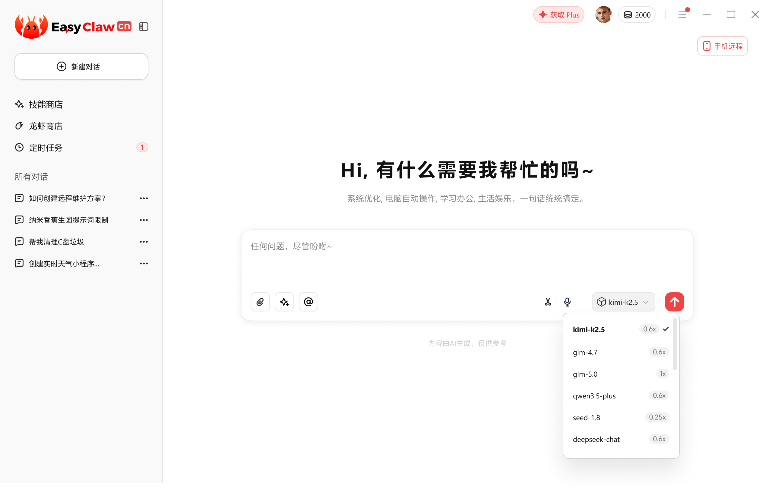 严格来说它不是 OpenClaw 的套壳,而是底层自研但完全兼容 OpenClaw 技能包。支持企业微信、QQ、飞书多平台遥控,内置混元、DeepSeek、GLM、Kimi 等多款模型可切换,新用户送 5000 Credits。