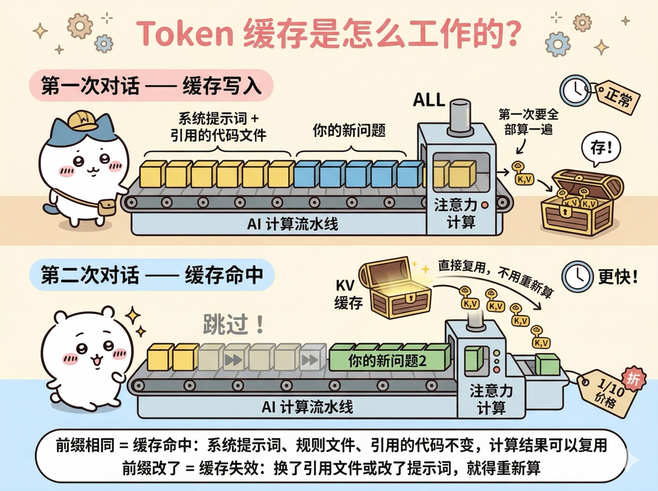 Token 缓存是一个能帮你省大钱的机制。简单来说,大模型在处理你的提示词时,需要做大量的计算。如果你连续多次对话,很多内容(比如系统提示词、引用的代码文件)是重复的,每次都重新计算就太浪费了。缓存机制会把这些中间计算结果保存下来,下次遇到相同的前缀内容就直接复用,不仅更快,还更便宜。