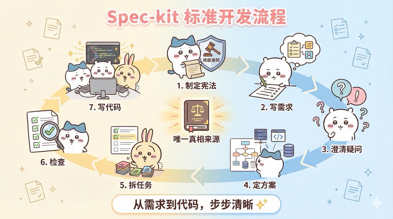到这里,我们已经学会了如何用 Spec-kit 开发完整项目,再复习一下完整流程: